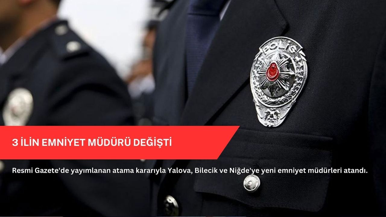 Niğde İl Emniyet Müdürü Yılmaz Delen Yalova İl Emniyet Müdürlüğüne, Polis Başmüfettişi Erdem Çağlar Bilecik İl Emniyet Müdürlüğüne ve Polis Başmüfettişi Erdinç Yüceer Niğde İl Emniyet Müdürlüğüne atandı.