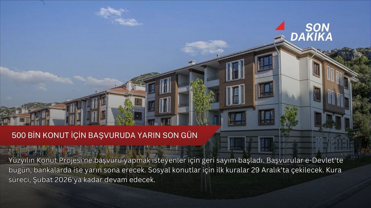 Şehirlerin barınma talebi, nüfus yoğunluğu ve ekonomik yapısı dikkate alınarak planlanan 500 bin sosyal konut için başvurular, e-Devlet üzerinden bugün saat 23.59'da, Ziraat Bankası, Halk Bankası, Emlak Katılım Bankası üzerinden ise yarın saat 17.00'de sona erecek.