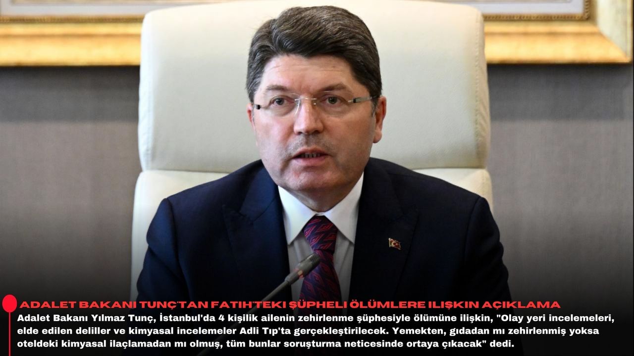 Adalet Bakanı Tunç, İstanbul Fatih'te konakladıkları otelde zehirlenme şüphesiyle hastaneye kaldırılmalarının ardından hayatlarını kaybeden anne, baba ve 2 çocuğa ilişkin soru üzerine, olayın ardından adli soruşturmanın hemen başlatıldığını anımsattı.