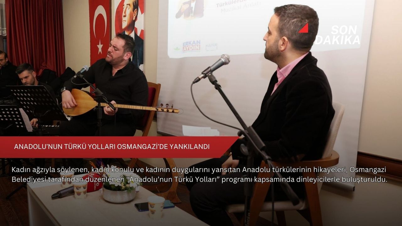 Asırlardır söylenerek günümüze ulaşan, dilden dile aktarılan ve kadınların kendi ağzından çıkan Anadolu türkülerinin izini süren Osmangazi Belediyesi, bu kapsamda “Anadolu’nun Türkü Yolları” programı gerçekleştirdi. Şadırvanlı Han Eğitim Akademisi’nde düzenlenen geceye katılan sanatseverler, bu türkülerin ne zaman, nerede ve kimler tarafından yakıldığını hikayeleriyle birlikte dinleme fırsatı elde etti. Türkülerin hikayelerini Doç. Dr. M. Emir İlhan anlatırken, eserler saz sanatçısı Selçuk Oruç tarafından seslendirildi. Gecede Diyarbakır, Şanlıurfa, Tokat, Manisa, Erzincan, Artvin, Afyon, Rumeli ve Kayseri, yöresinden 13 türkü icra edildi.