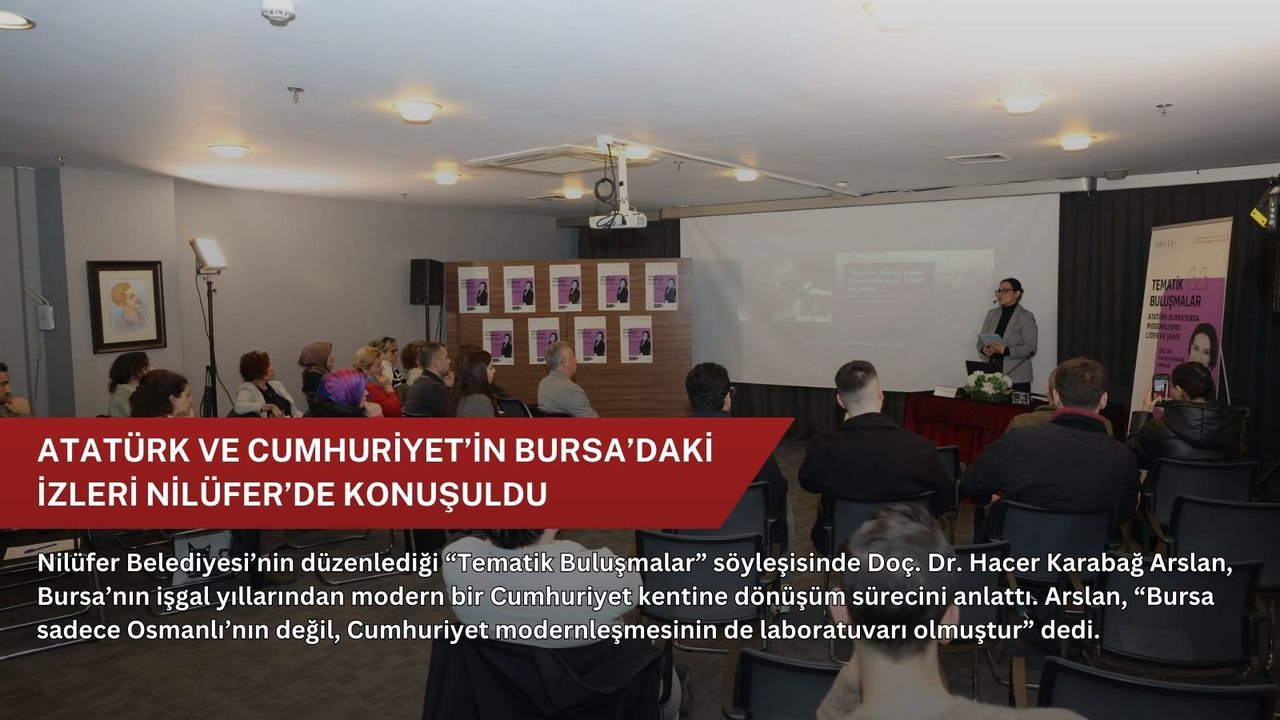 Nazım Hikmet Kültürevi’nde düzenlenen “Atatürk Bursa’sında Modernleşme: Lider ve Şehir” başlıklı söyleşide Arslan, Atatürk’ün Bursa’ya gerçekleştirdiği ziyaretlerin arka planını ve kentin sosyal, ekonomik ve kültürel değişimini katılımcılara aktardı.