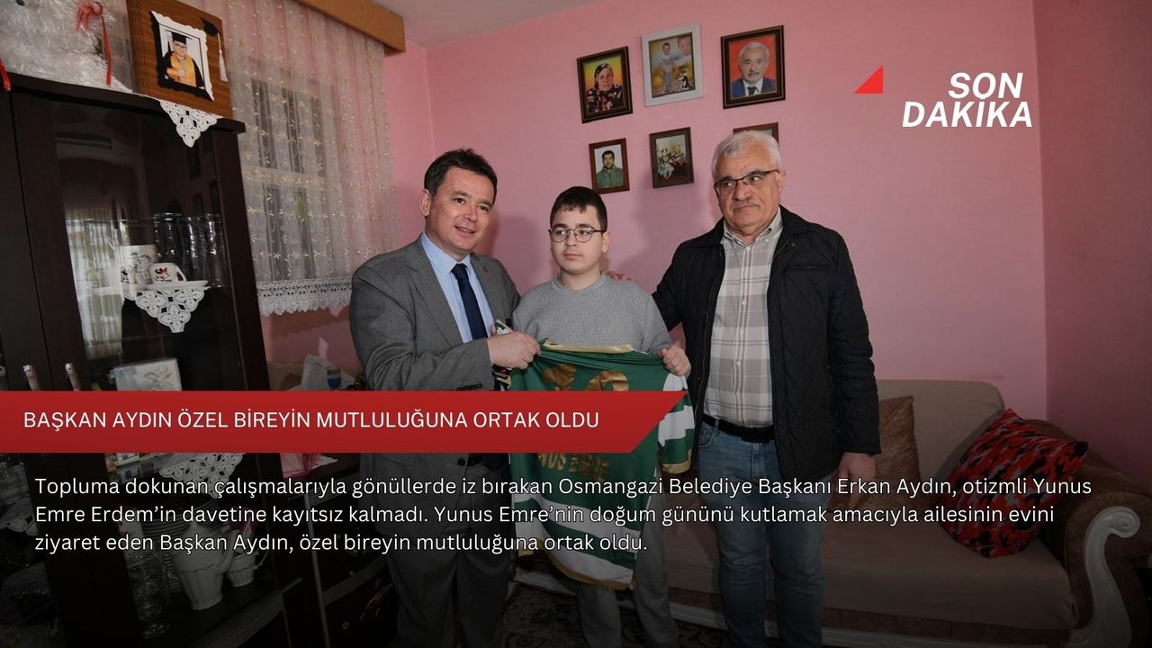 İstiklal Mahallesi’nde yaşayan otizmli Yunus Emre Erdem, vatandaş ile belediye arasında iletişim köprüsü olan Osmangazi Çağrı Merkezi’ni arayarak Osmangazi Belediye Başkanı Erkan Aydın’dan doğum günü için Bursaspor forması talep etti. Çağrı merkezine ulaşan bu anlamlı istek üzerine harekete geçen Başkan Erkan Aydın, İstiklal Mahalle Muhtarı Mümin Gözyılmaz ile birlikte Yunus Emre’yi evinde ziyaret ederek gönülleri ısıtan bir sürprize imza attı.