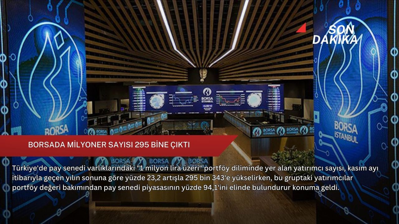 "Milyoner" yatırımcı sayısı geçen yılın sonunda 239 bin 742 iken, kasım itibarıyla yüzde 23,2 yükselişle 295 bin 343'e yükseldi. Böylece, Borsa İstanbul'a 55 bin 601 yeni "milyoner" yatırımcı eklendi. Aynı dönemde bu yatırımcıların yönettiği toplam portföy büyüklüğü de 5 trilyon 263 milyar 224 milyon liradan, 6 trilyon 852 milyar 788 milyon liraya çıktı.
