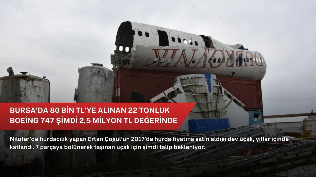 Bursa’da hurdacılık yapan 51 yaşındaki Ertan Çoğul’un 2017 yılında 80 bin TL’ye satın aldığı 22 tonluk hurda Boeing 747, bugün yaklaşık 2,5 milyon TL değer biçilen sıra dışı bir yatırıma dönüştü.