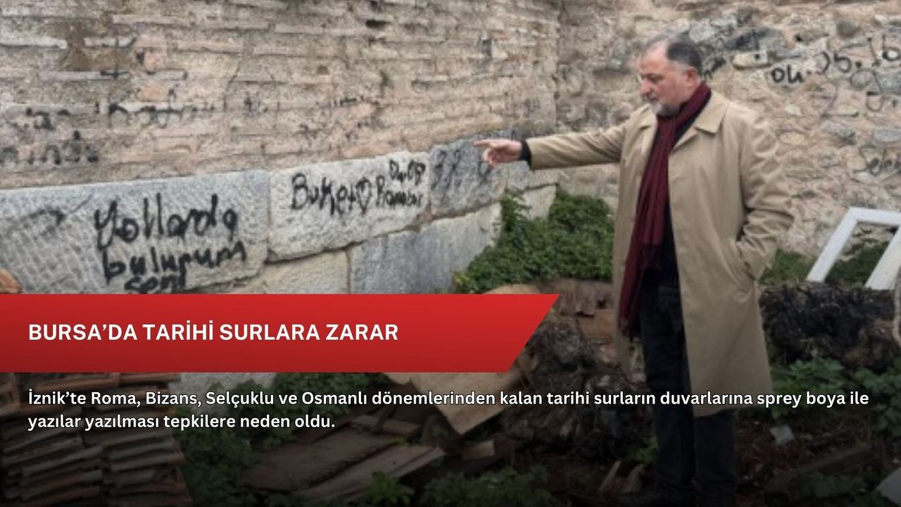 Bursa’nın tarihi ilçesi İznik’te, yaklaşık 2 bin yıllık surlarda sprey boya ile yazılan yazılar büyük tepki topladı. Roma, Bizans, Selçuklu ve Osmanlı medeniyetlerinin izlerini taşıyan surlar, kentin simgeleri arasında yer alıyor ve yerli-yabancı turistlerin yoğun ilgisini çekiyor.