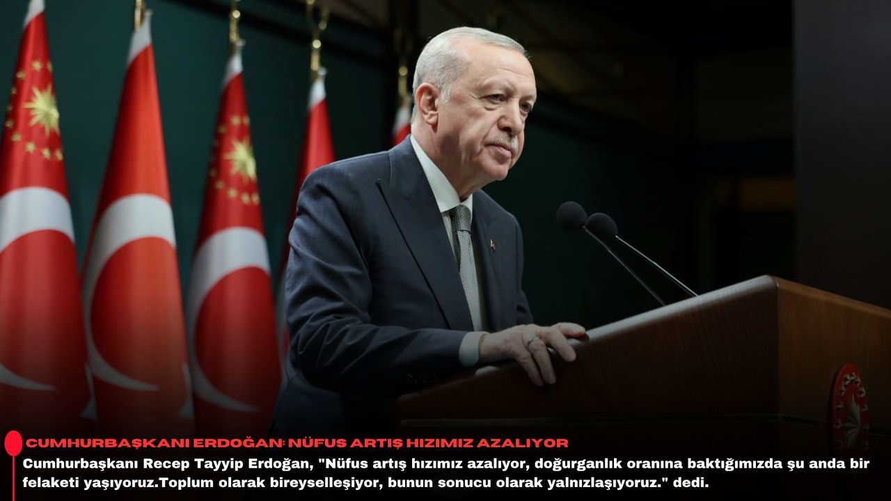 Türkiye'de nüfus artış hızının düştüğüne bir kez daha dikkati çeken Erdoğan, "Nüfus artış hızımız azalıyor, doğurganlık oranına baktığımızda şu anda bir felaketi yaşıyoruz.Toplum olarak bireyselleşiyor, bunun sonucu olarak yalnızlaşıyoruz. Toplam doğurganlık hızı 1,48 şu anda bir felaketi yaşıyoruz" dedi.