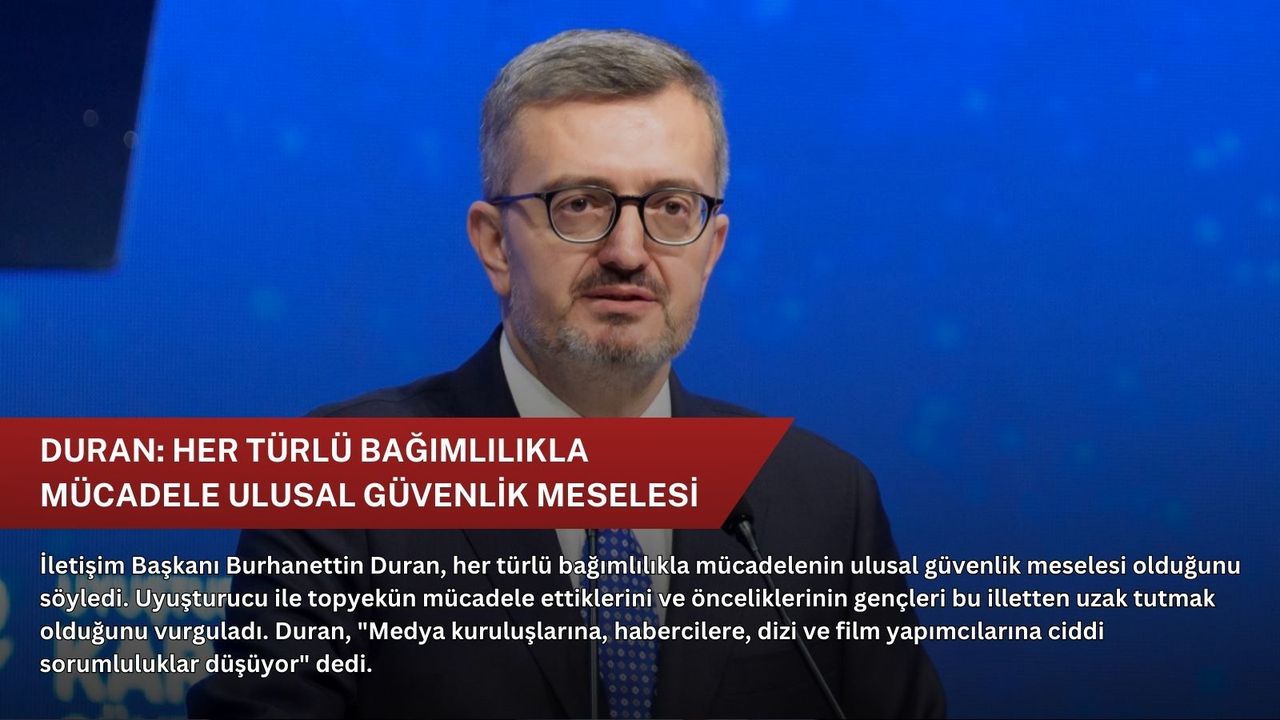 İletişim Başkanlığı olarak, toplumun uyuşturucuya ve her türden bağımlılığın farkında olmasına yönelik yayınları, yapımları ve içerikleri olanca güçleriyle desteklemeye devam ettiklerini belirten Burhanettin Duran, "TRT, Anadolu Ajansı ve RTÜK başta olmak üzere tüm kamu kurum ve kuruluşlarımızla bu çerçevede koordineli bir şekilde çalışıyor ve her türlü bağımlılığa karşı koruyucu bir dilin inşası için birlikte çalışıyoruz." dedi.