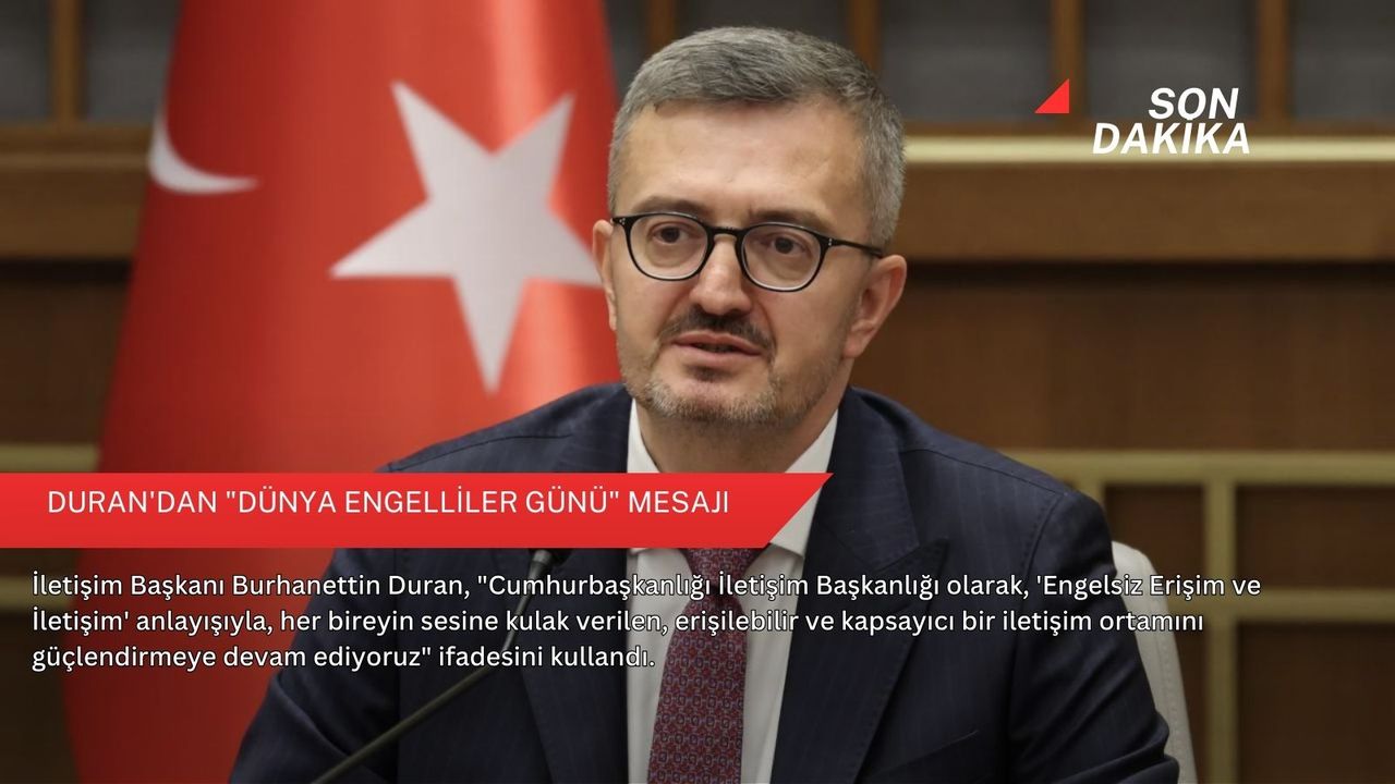 Duran, bu kapsamda yürüttükleri Engelsiz CİMER, Kulak Ver Projesi ve Engelsiz Erişim ve İletişim Kılavuzu gibi çalışmalarla iletişimde fırsat eşitliğini daha da geliştirmeyi hedeflediklerini ifade ederek, "3 Aralık Dünya Engelliler Günü'nün engelli bireylere yönelik toplumsal farkındalığı ve duyarlılığı artırmasını temenni ediyorum" değerlendirmesinde bulundu.