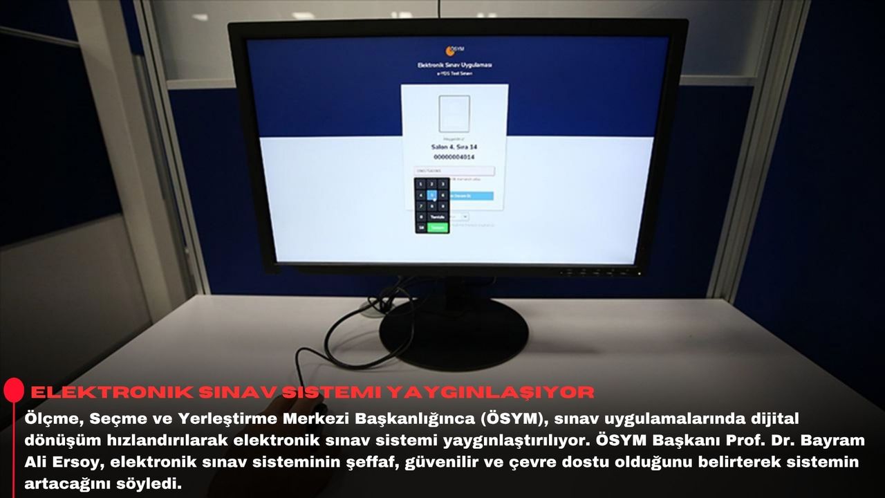 "2023'te Eczacılıkta Uzmanlık Eğitimi Giriş Sınavı (EUS) ve Eczacılık Alanında Seviye Tespit Sınavı (STS- Eczacılık) elektronik ortamda uygulandı. Böylece ilk kez yabancı dil sınavları dışında farklı alanlarda sınavlar elektronik ortama dahil edildi. 2024'te Gelir İdaresi Başkanlığı Devlet Gelir Uzman Yardımcılığı Giriş Sınavı (DGUY) ve Gelir İdaresi Başkanlığı Gelir Uzman Yardımcılığı Giriş Sınavı (GUY) elektronik ortamda düzenlendi. Geçen yıl 19 sınav elektronik ortamda yapıldı. Bu yıl Electronic-Test of English Proficiency (e-TEP) uygulaması hayata geçirildi. Ayrıca Öğretmenlik Meslek Bilgisi Alanında Seviye Tespit Sınavı ve Sayıştay Eleme Sınavı elektronik ortama dahil edildi."