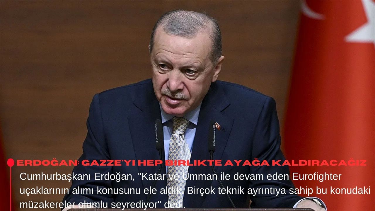 Gazze'nin, İslam dünyası için bir imtihan kağıdı olduğunu aktaran Cumhurbaşkanı Erdoğan, "Gazze’yi hep birlikte ayağa kaldıracağız. Buna sadece Türkiye veya sadece Mısır, diğer körfez ülkeleri tek başına muktedir olabilir mi, elbette hayır. Bu, müstakil bir toplu inşa ve ihya çalışmasıdır. Bunun için de bütün duraklarımızda kapsamlı görüşmeler gerçekleştirdik. Gidemediğim yerlere Dışişleri Bakanımı, İstihbarat Başkanımı, Milli Savunma Bakanımı gönderip, “görüşmeler onlar vasıtasıyla yürüsün” dedim. Bu temaslar devam ediyor. Körfez ülkelerindeki kardeşlerimize açık ve net bir şekilde çağrımızı yaptık. Az önce de söylediğim gibi, artık söz değil, icraat zamanı. Kuveyt’te, Katar’da, Umman’da bu konuda güçlü ve samimi bir irade, bunun yanında da vicdani bir hassasiyet gördük. Özellikle Katar, zaten bugüne kadar Filistin’e en çok destek veren ülkelerden biri. Gazze, İslam dünyası için bir imtihan kağıdıdır. İnşallah bu sınavdan alnımızın akıyla geçecek ve kardeşlerimizin yanında en güçlü şekilde yerimizi alacağız. İsrail’in saldırıları, Gazze’nin maalesef altyapısını yerle bir etti. Şimdi burada çok ciddi hafriyat çalışmaları yapılarak, bu yıkımları kaldırmamız gerekiyor. Önce iş makinelerinin yapacağı çalışmalar, ardından altyapıya yönelik atılacak adımlar var. Gazze’de hastaneler, okullar ibadethaneler, fırınlar, bunların hepsi yerle yeksan edildi. Bunun yeniden inşası kolay bir iş değil. Başta Körfez ülkeleri olmak üzere, hep birlikte bu adımı inşallah atacağız. Gazze, bütün insanlığı yıllar boyunca utandıran bir vahşete tanık oldu. Gazzeli kardeşlerimize insanlık olarak onurlu ve müreffeh bir geleceği hep beraber hazırlamamız gerekiyor. Türkiye, bu noktada her türlü fırsatı değerlendirerek elinden gelen gayreti ortaya koyacak" diye konuştu.