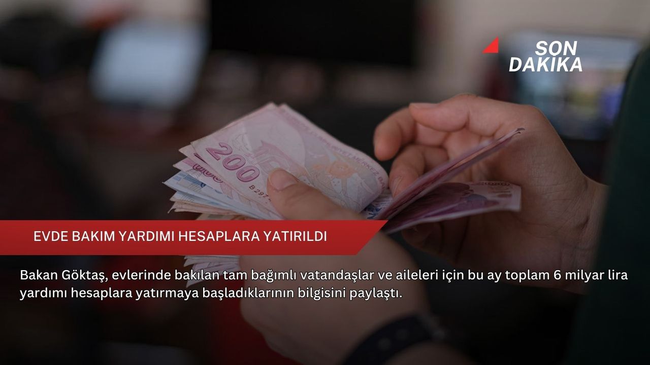 Bakan Göktaş, "Evlerinde bakılan tam bağımlı vatandaşlar ve aileleri için bu ay toplam 6 milyar lira evde bakım yardımını hesaplara yatırmaya başladık. Ödemelerin tüm engelli vatandaşlarımıza ve ailelerine hayırlı olmasını diliyorum." ifadesini kullandı.