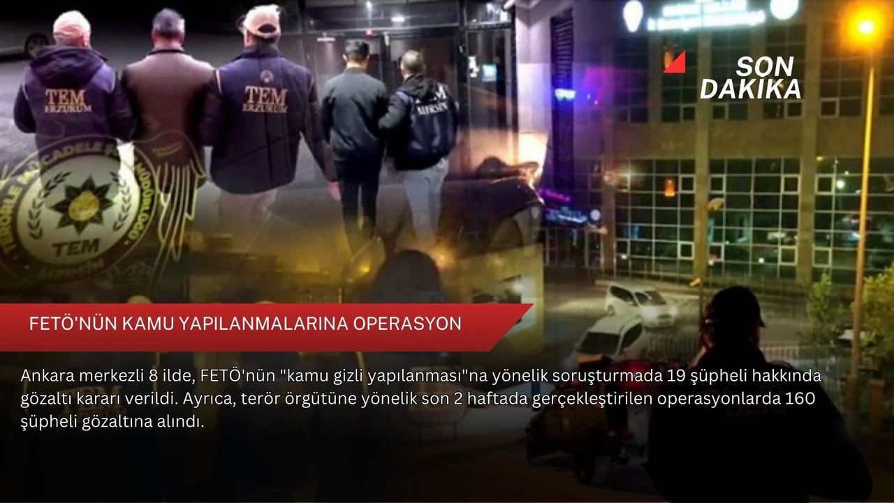 Ankara merkezli 8 ilde, FETÖ'nün "kamu gizli yapılanması"na yönelik soruşturmada 19 şüpheli hakkında gözaltı kararı verildi.