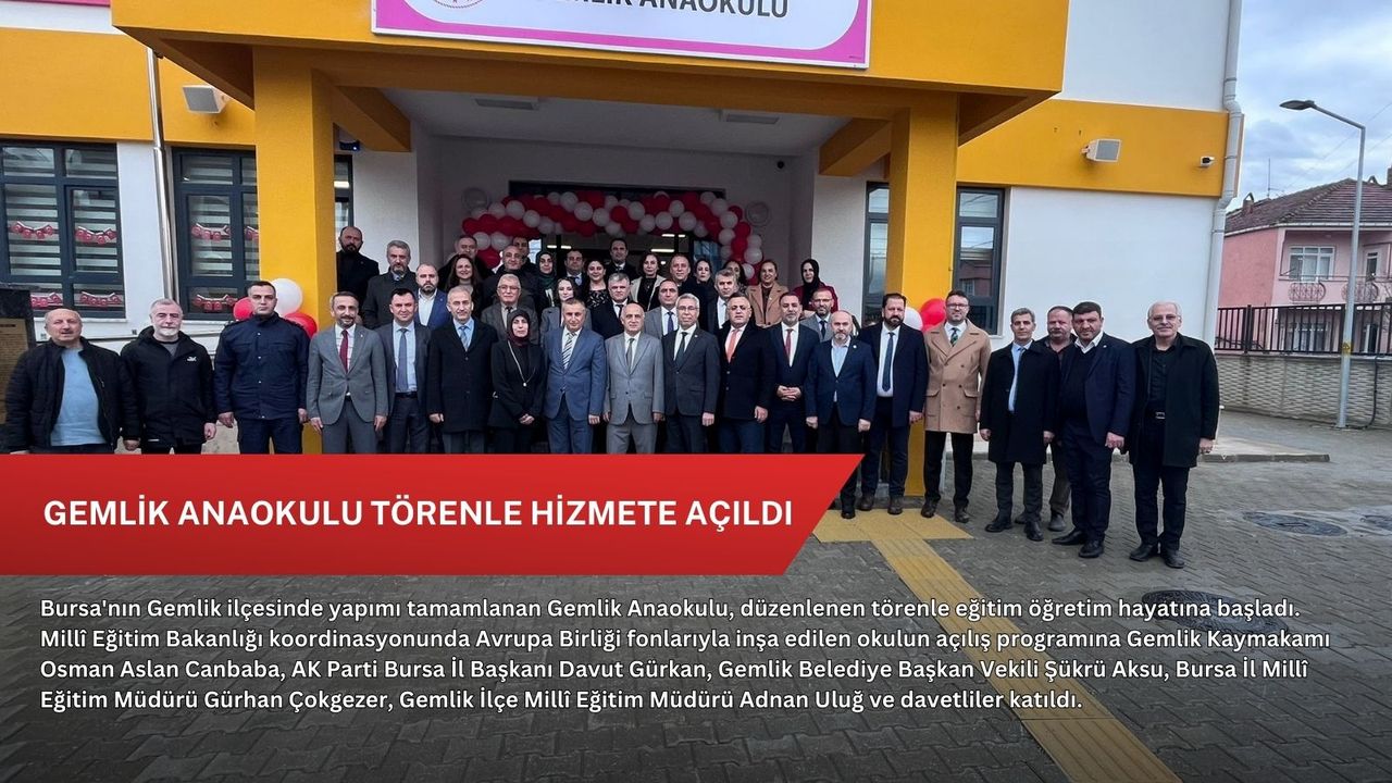 Millî Eğitim Bakanlığı koordinasyonunda Avrupa Birliği fonlarıyla Bursa genelinde inşa edilen dört anaokulundan biri olan Gemlik Anaokulu, 2 Şubat 2026 tarihi itibarıyla 115 öğrenciyle eğitim öğretime başlamış olup; 4 ve 5 yaş gruplarında ikili eğitim sistemiyle toplam 320 öğrenciye hizmet verebilecek kapasiteye sahip. Yeni eğitim yuvasının, bölgedeki okul öncesi eğitim ihtiyacını önemli ölçüde karşılaması hedefleniyor.