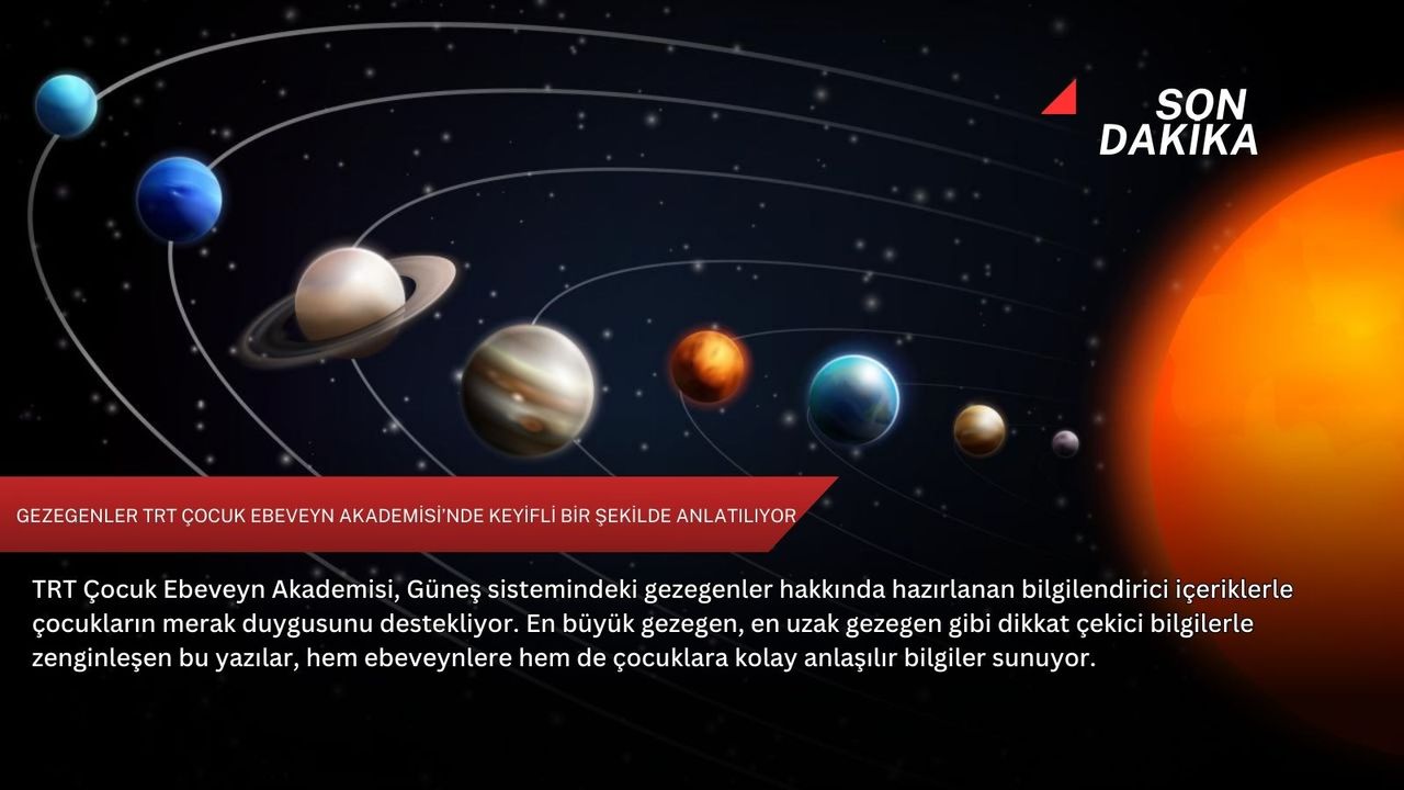 TRT Çocuk Ebeveyn Akademisi’nde yayımlanan “Gezegenlerin Büyükten Küçüğe Sıralanışı” başlıklı makale, Güneş sistemindeki gezegenlerin özelliklerini çocukların ilgisini çekecek bir dilde aktarıyor. Hem eğitici hem de merak uyandıran içerik, ailelerin birlikte keşif yapabileceği keyifli bir öğrenme deneyimi sunuyor.