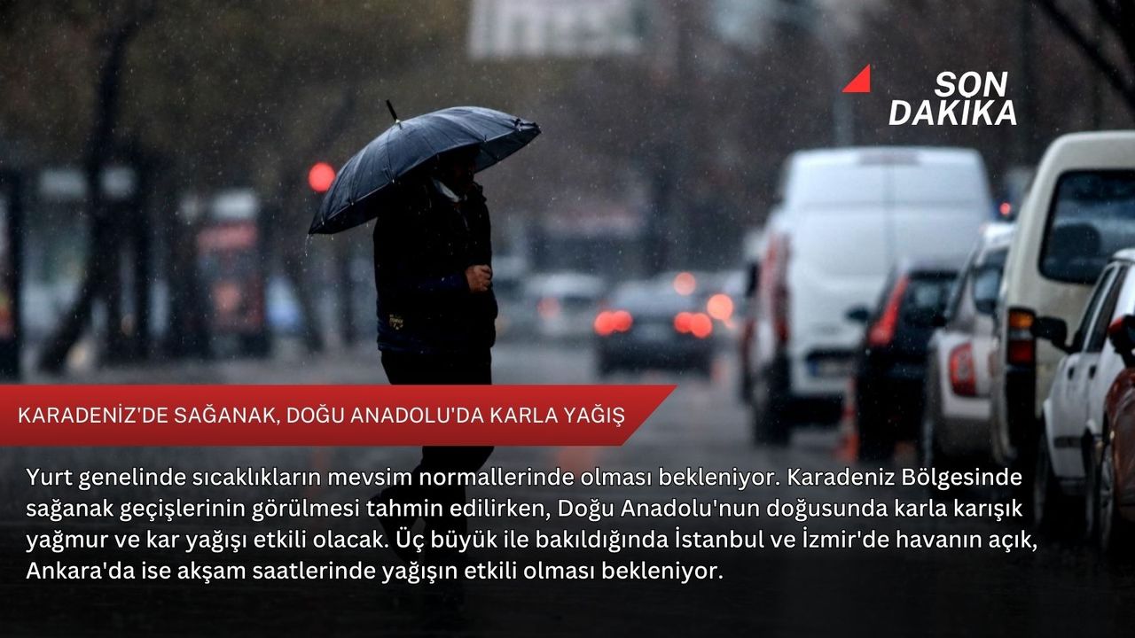 Genellikle yağmur ve sağanak, Doğu Anadolu'nun doğusu ile Sivas çevrelerinde karla karışık yağmur ve kar şeklinde görülmesi beklenen yağışların, Orta ve Doğu Karadeniz kıyılarında yer yer kuvvetli olacağı bekleniyor.