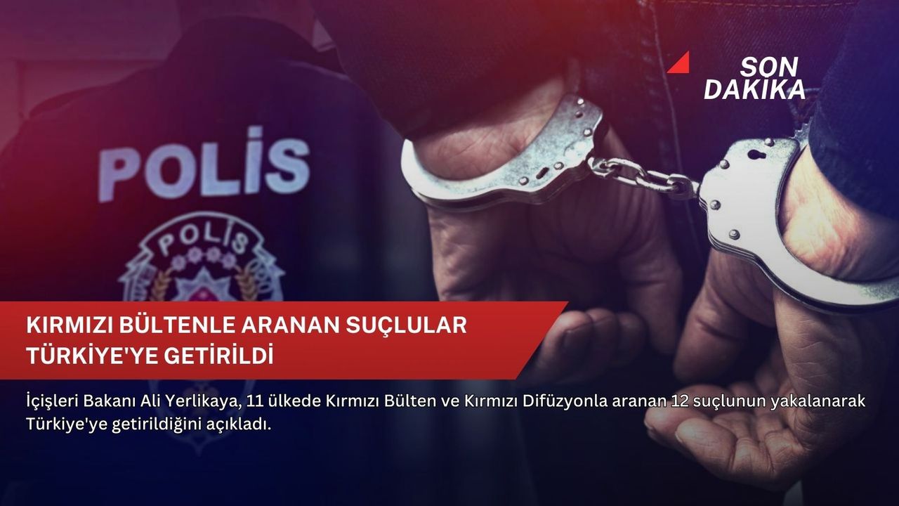İçişleri Bakanı Ali Yerlikaya, NSosyal hesabından yaptığı açıklamada, kırmızı bültenle ve difüzyon mesajıyla aranan İ.F, E.T, A.B, K.B, D.H, Ö.V, M.D, R.Ö, R.Y, M.U, O.Y. ve İ.D. ile ulusal seviyede aranan B.G, M.D, S.T, M.S. ve H.M.K'nin yakalanarak Türkiye'ye iadelerinin sağlandığını belirtti.