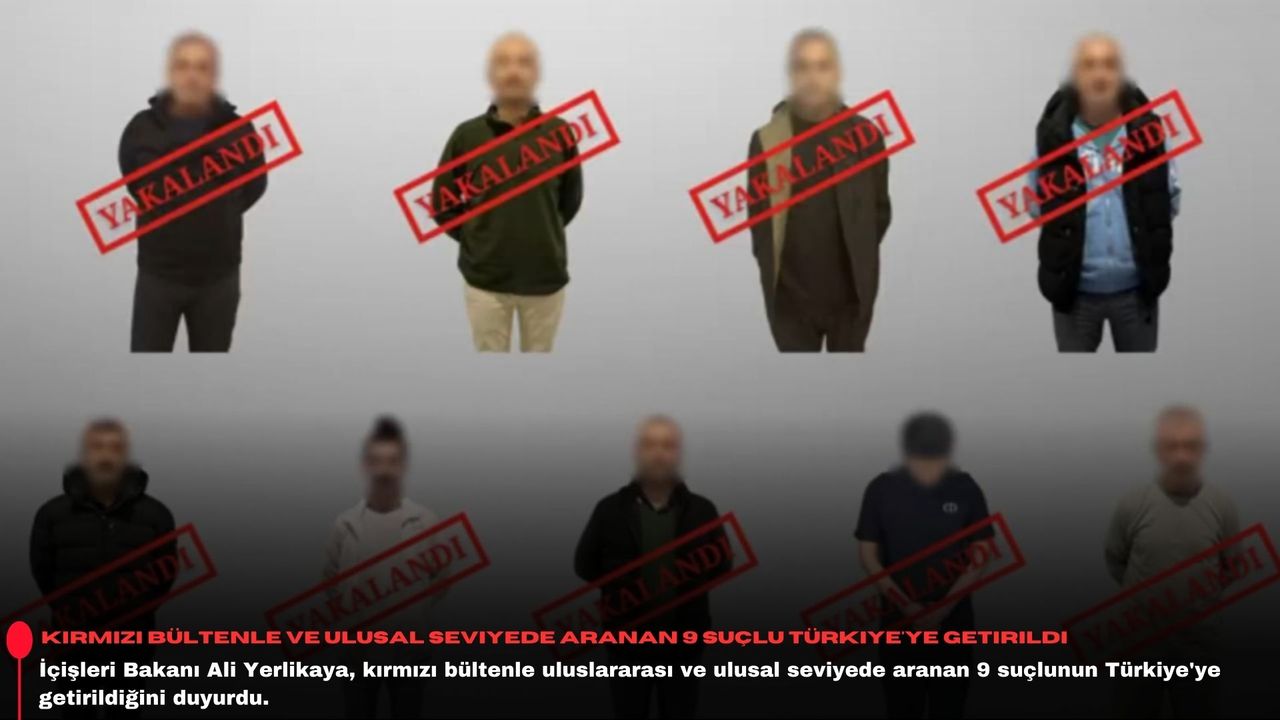 Bakan Ali Yerlikaya, NSosyal hesabından yaptığı açıklamada, kırmızı bültenle uluslararası seviyede aranan M.Ç., S.G., V.Y., A.S.Ö., O.K., G.A., G.A. ile ulusal seviyede aranan E.A.Ü. ve K.A.'nın yakalandığını açıkladı.