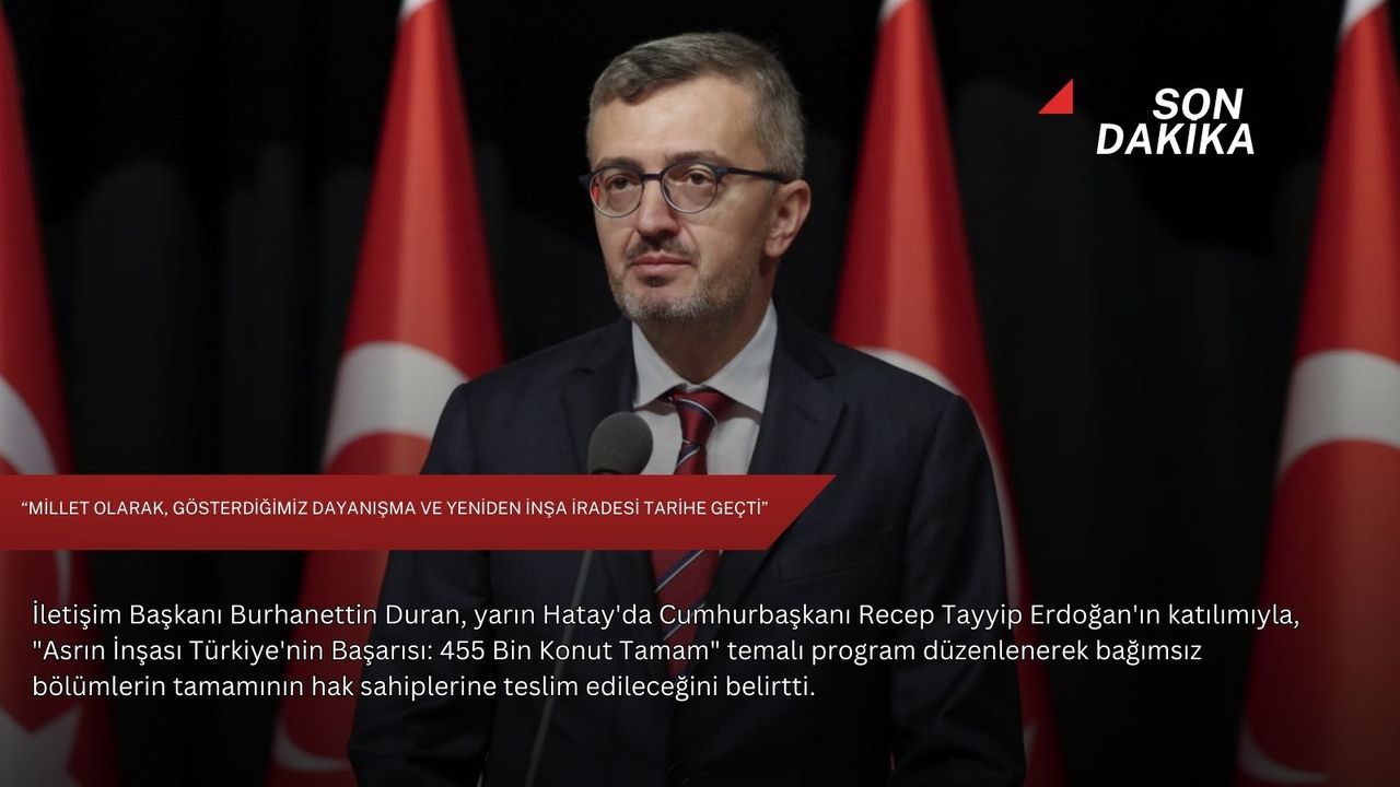 "Umudu büyüten, dayanışmayı güçlendiren bu büyük seferberlik, kararlılığın ve inancın en somut göstergesi oldu. Millet olarak, gösterdiğimiz dayanışma ve yeniden inşa iradesi tarihe geçti. Yarın Sayın Cumhurbaşkanımızın teşrifleriyle Hatay'da düzenlenecek 'Asrın İnşası Türkiye'nin Başarısı: 455 Bin Konut Tamam' temalı programla bu büyük emek taçlanacak, bağımsız bölümlerin tamamı hak sahibi kardeşlerimize teslim edilecek. Şimdiden hayırlı olmasını diliyorum."