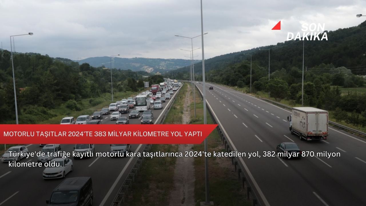 Buna göre, Türkiye'de trafiğe kayıtlı motorlu kara taşıtları tarafından 2024'te 382 milyar 870 milyon kilometre yol katedildi. Toplam taşıt-kilometrenin yüzde 57'si otomobiller, yüzde 19,2'si kamyonetler, yüzde 8,7'si motosikletler, yüzde 5,7'si çekiciler, yüzde 3,8'i kamyonlar, yüzde 3,3'ü minibüsler, yüzde 1,9'u otobüsler ve yüzde 0,5'i özel amaçlı taşıtlar tarafından yapıldı.