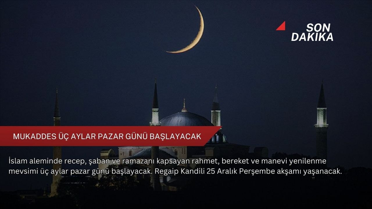 Diyanet İşleri Başkanlığı Vakit Hesaplama Bölümü'nün "vakithesaplama.diyanet.gov.tr" internet adresinde yer alan bilgiye göre, üç ayların başlangıcı recep ayında idrak edilecek. Regaip Kandili, 25 Aralık Perşembe akşamı yaşanacak.