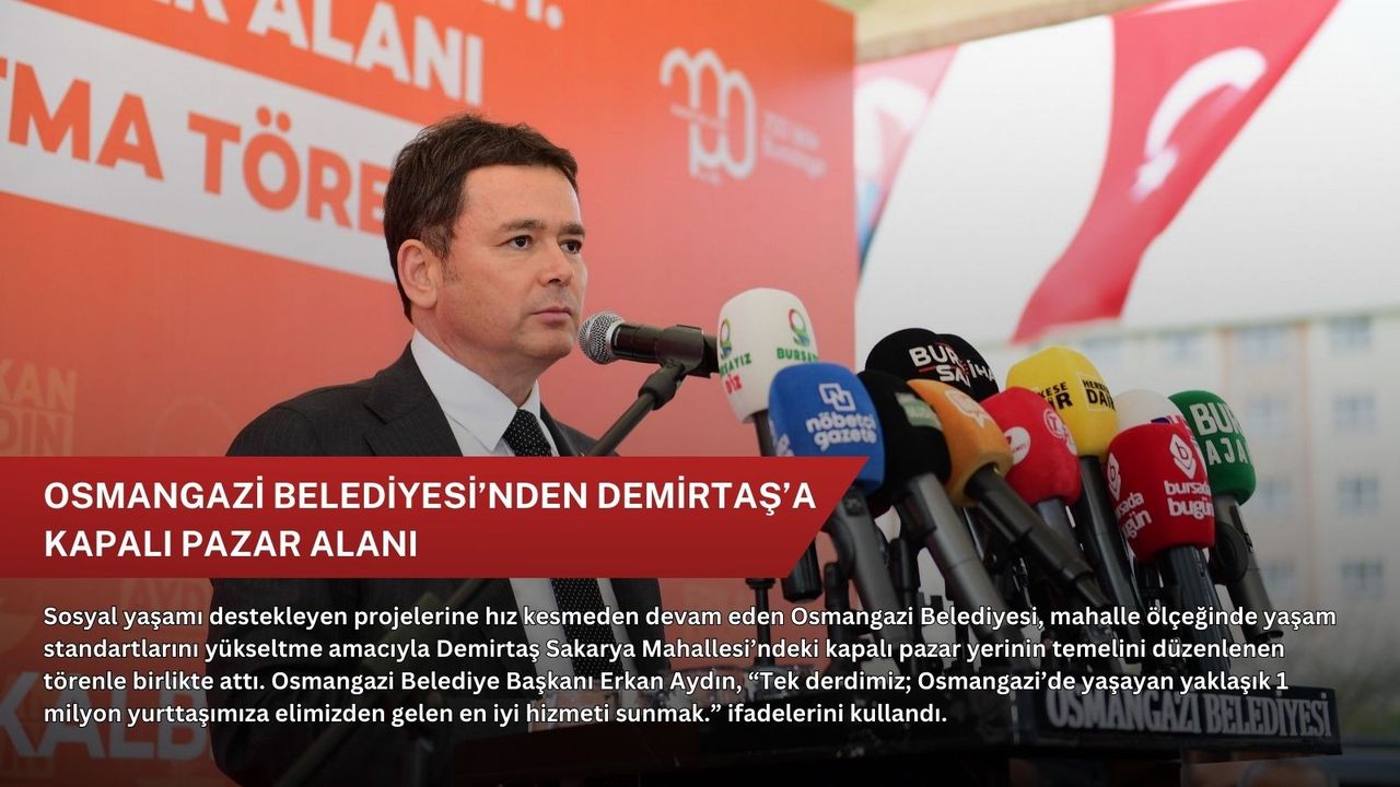 Kentin ihtiyaçlarını doğru analiz ederek, planlı ve vizyoner belediyecilik anlayışını somut projeler ile ortaya koyan Osmangazi Belediyesi, Demirtaş Sakarya Mahallesi’nde hayata geçireceği Kapalı Pazar Alanı projesinin temel atma törenini gerçekleştirdi. Yoğun ilginin olduğu törene Osmangazi Belediye Başkanı Erkan Aydın’ın yanı sıra Türkiye Büyük Millet Meclisi CHP Grup Başkanvekili Murat Emir, CHP Tekirdağ Milletvekili İlhami Özcan Aygun, CHP Bursa Milletvekili Orhan Sarıbal, CHP Bursa İl Başkanı Nihat Yeşiltaş, CHP Osmangazi İlçe Başkanı Raşit Gürbüz, Nilüfer Belediye Başkanı Şadi Özdemir, Gemlik Belediye Başkanı Şükrü Deviren, Osmangazi Muhtarlar Derneği Başkanı Burhan Mandacı, Pazarcılar Odası Başkanı Refik Aksu, Demirtaş Sakarya Mahalle Muhtarı Mümin Dündar ile çok sayıda vatandaş katılım gösterdi.