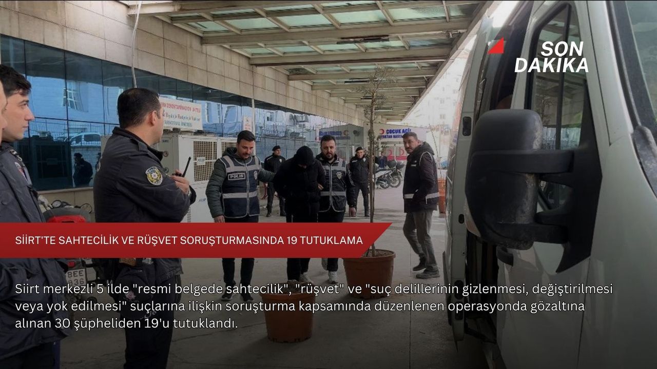 Laboratuvarlarda sonuçları değiştirdikleri iddiasıyla "resmi belgede sahtecilik", "rüşvet" ve "suç delillerinin gizlenmesi, değiştirilmesi veya yok edilmesi" suçlarından yakalama kararı çıkarılan 40 şüpheliden Siirt Emniyet Müdürlüğünce yürütülen teknik takip sonucu Siirt, İstanbul, İzmir, Mersin ve Diyarbakır'da düzenlenen operasyonlarda önceki gün gözaltına alınan 8'i hastane personeli 30 şüpheli emniyetteki işlemlerinin ardından adliyeye sevk edildi.