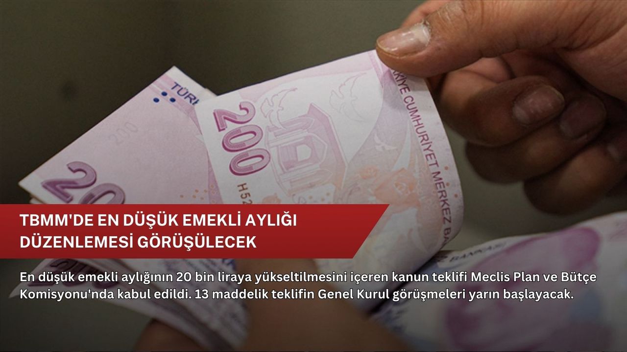 En düşük emekli aylığında artış için gözler Türkiye Büyük Millet Meclisi'nde. En düşük emekli maaşını 20 bin liraya yükseltecek kanun teklifi Meclis Plan ve Bütçe Komisyonu'nda kabul edildi. Düzenlemeden 4 milyon 917 bin emekli faydalanacak.