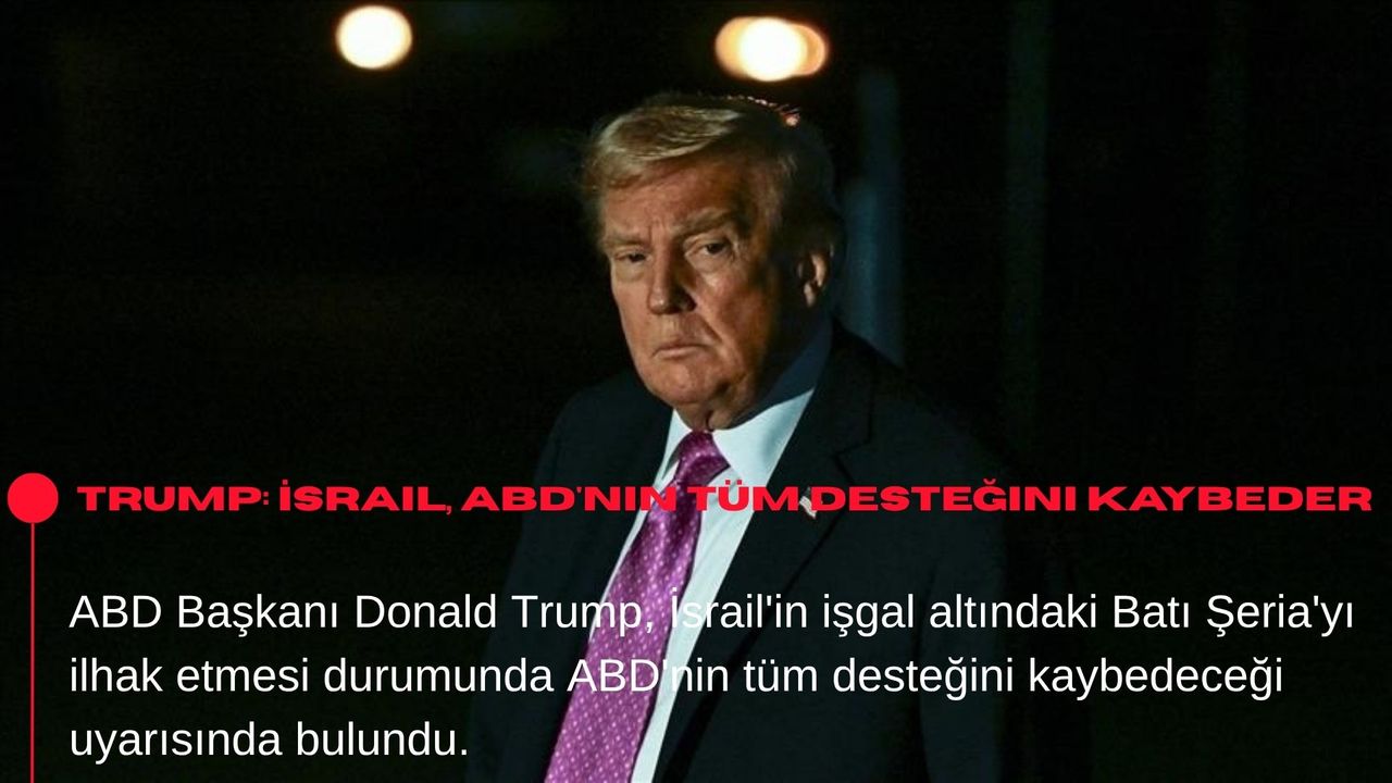 Trump, İsrail'deki Binyamin Netanyahu hükümetinin Batı Şeria'yı ilhak yönünde adım atması halinde ne olacağına dair soruya, "Bu olmayacak, bu olmayacak. Arap ülkelerine söz verdiğim için bu olmayacak. Bunu şimdi yapamazsınız. Böyle bir şey olursa İsrail, ABD'nin tüm desteğini kaybeder." yanıtını verdi.