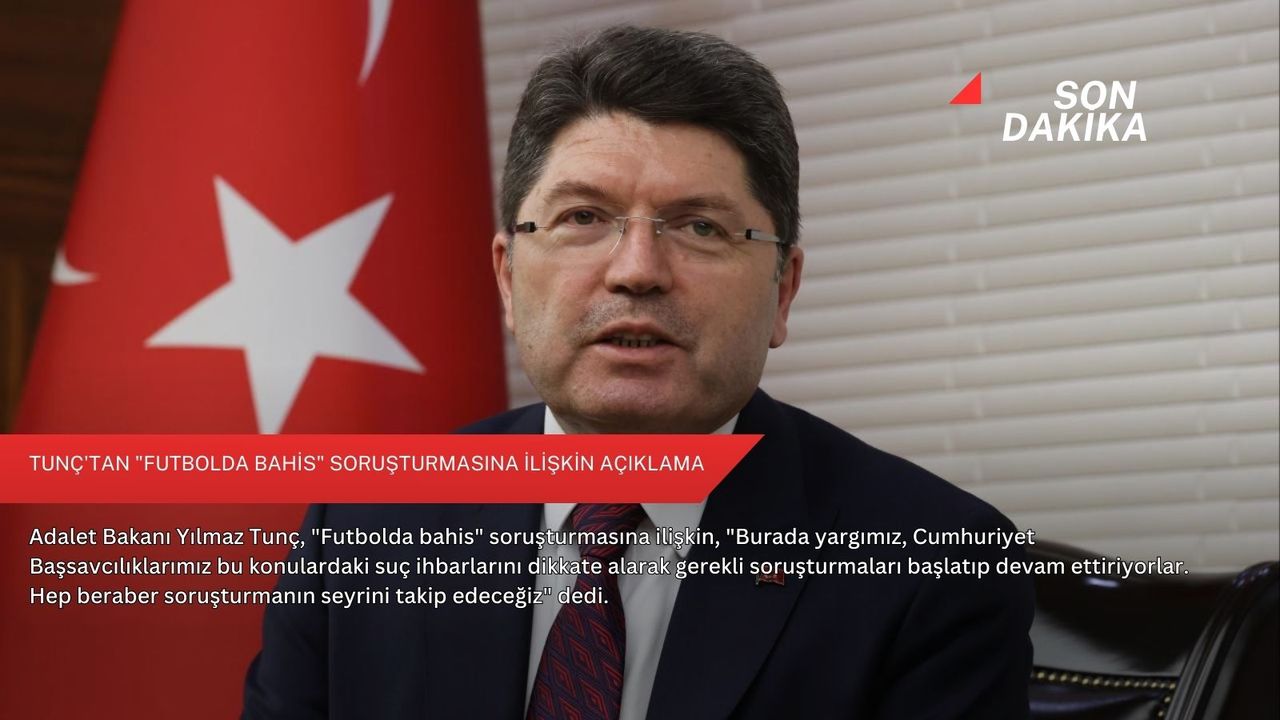 Trabzon'da temaslarda bulunan Adalet Bakanı Yılmaz Tunç, bir gazetecinin "Futbolda bahis" soruşturması kapsamında görüşleri sorulması üzerine, "İstanbul Cumhuriyet Başsavcılığımızın sürdürdüğü soruşturmalar kapsamında gerçekleştirilen işlemler. Burada yargımız, Cumhuriyet Başsavcılıklarımız bu konulardaki suç ihbarlarını dikkate alarak gerekli soruşturmaları başlatıp devam ettiriyorlar. Hep beraber soruşturmanın seyrini takip edeceğiz. Başsavcılıklarımızdan bu konuda açıklamalar önümüzdeki süreçte yapılır" yanıtını verdi.