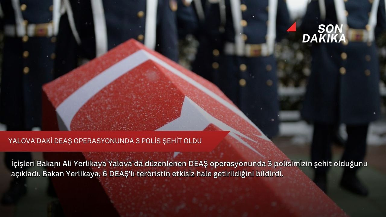 İçişleri Bakanı Ali Yerlikaya, "Son bir ay içerisinde DEAŞ terör örgütüne yönelik yürütülen operasyonlarda 137 şüpheli yakalanmış, 97 şüpheli hakkında ise adli kontrol kararı uygulanmıştır. Bu kararlılığın bir devamı olarak bu sabah 15 ilimizde 108 ayrı adrese eş zamanlı operasyon düzenlenmiştir. Bu operasyonlardan biri de bu sabah saat 02:00'de Yalova'da gerçekleşmiştir. İsmet Paşa Mahallesi Seher Sokak'ta bulunan bir adrese düzenlenen operasyon sırasında DEAŞ'lı teröristler tarafından kahraman polislerimize ateş açılmıştır. Bu hain saldırı sonucunda maalesef 3 kahraman polisimiz şehit olmuştur. Saldırıda 8 polisimiz ve bir bekçimiz de yaralanmıştır. Teröristlerin bulunduğu evde kadınlar ve çocukların olması nedeniyle operasyon büyük bir hassasiyetle yürütülmüştür. Adreste bulunan 5 kadın ve 6 çocuk sağ olarak tahliye edilmiştir. Çıkan çatışmada 6 terörist ölü olarak ele geçirilmiştir. Bu teröristler Türk vatandaşıdır. Operasyon saat 09:40'ta tamamlanmıştır" dedi.